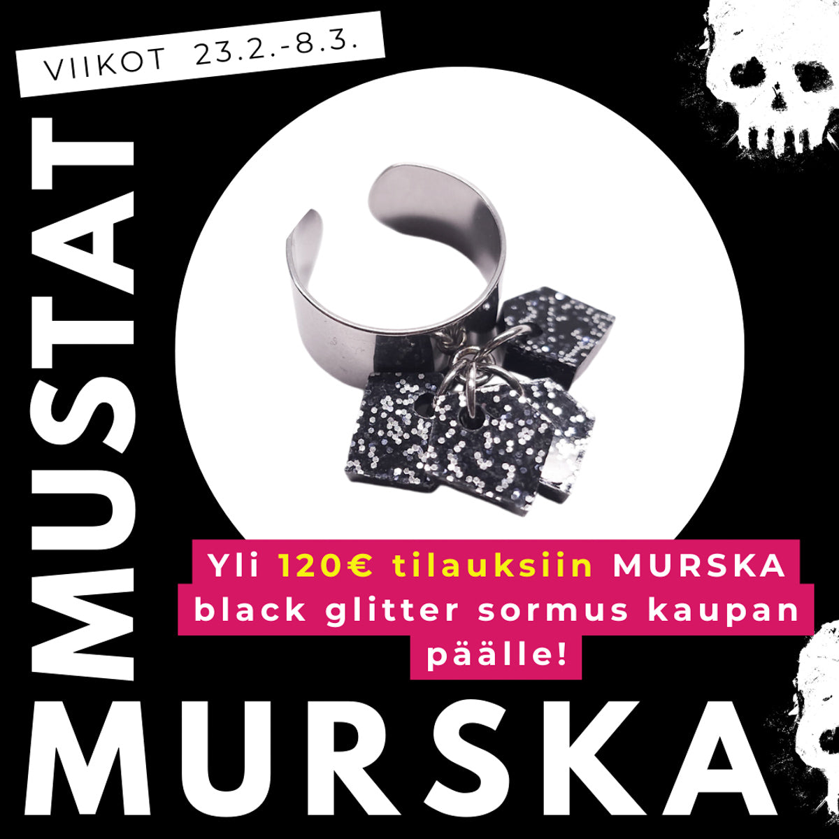 ⚡ Yli 120€ tilauksiin MURSKA black glitter sormus kaupan päälle!
