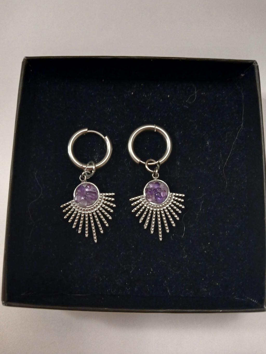 Kauniit teräs rengas korvakorut, joissa riippuu boho tyylinen ametisti Murska amuletti 💜😍